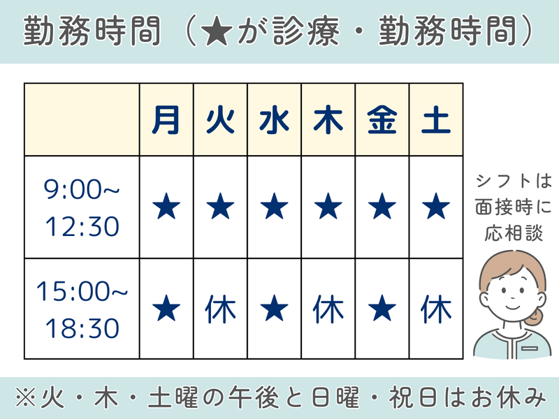 勤務時間詳細 【月・火・水・木・金・土】9:00〜12:30 【月・水・金】15:00~18:30 ※残業はほとんどありません。 ※他スタッフとの兼合いの上で決定しますが 無理な曜日などございましたら面接時ご相談ください ★午前・午後、1コマ3.5~4時間程度の勤務になります。