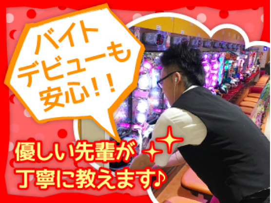 仕事内容 パチンコ店での接客等のホール業務をお任せします。 専門知識は不要!店内の見回り、台拭き、エラー対応、カウンター業務などをお任せします! 接客未経験の方やバイトデビューの方、パチンコで遊んだ経験が無いという方も、優しい先輩スタッフがイチから丁寧に教えますよ! まずは「いらっしゃいませ」と元気な挨拶からスタート! 「怖い・・・」と思われるかもしれません。 でも、当店は地域に根差したお店なので常連様も多く、優しい方も多いんです!!