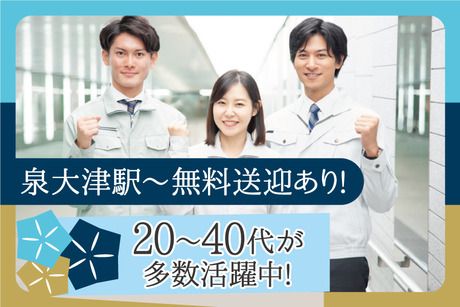 アクセス 南海本線 泉大津西出口徒歩約39分、南海本線 松ノ浜徒歩約43分、南海本線 北助松西出口徒歩約54分 車・バイク通勤可 南海本線「泉大津駅」よりスタッフ送迎バスあり