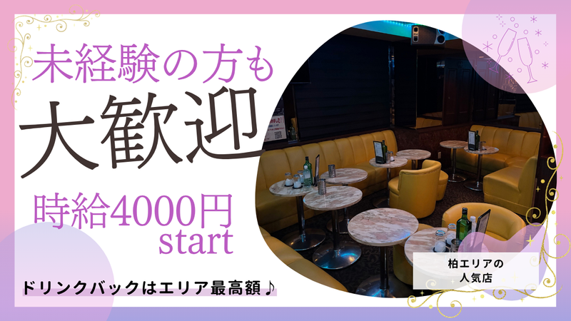 仕事内容 *・。★ 『柏』エリアの人気店!! ★.・* 来店されたお客様と楽しくお話しをしたり 簡単なお酒を作ったりするだけ♪ お酒は飲めなくてもOK◎ 接客未経験の方も安心の ”サポート体制バッチリ”のお店です! ☆・。*:・+。。・*★:.。*☆・。*:・+。。・*★:.。* < 時給は”4,000円以上”スタート! > < ドリンクバックキャンペーン中☆ > エリア最高クラスの「500円」バック!! (※入店後3ヶ月保障) < ノルマやペナルティーも一切なし > 難しい決まりも一切ないので、 ストレスフリーで楽しみながら稼げます! 千葉県内でも人気のエリアなので 沢山のお客様が来店されるお店です◎ なので、想像以上の高収入が見込めますよ♪ < ドレスはレンタルでOK! > ドレスは無料でレンタルいたしますので 事前に用意しておかなくて大丈夫です。 着たいものがあれば持ち込みもOKです♪ ☆・。*:・+。。・*★:.。*☆・。*:・+。。・*★:.。* << 資格や経験は”一切不要”!! >> 現在活躍中のスタッフも ほとんどが未経験からのスタート!! 「人と話すのが好き」「とにかく稼ぎたい」 それだけで十分です◎ もちろん飲食店、コンビニ、アパレルなどの ”接客経験”がある方は経験を活かせます! お仕事のジャンル関係なく、 「お客様と話したことがある。」 という方は、活かせる場面が必ずあります◎ 経験者・未経験者も、ブランクのある方も 入社後しっかりとした研修を受け 自信を持って席に着けるよう 我々がしっかりとサポートいたしますので 安心してご応募下さい!d(・ω<*) ☆・。*:・+。。・*★:.。*☆・。*:・+。。・*★:.。*