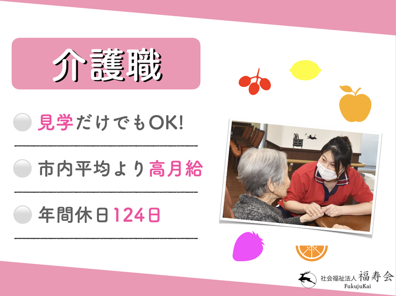 選考プロセス ⏩従業員増員中⏩ 福寿会では働きやすい環境を 整えています。 また、業績好調につき事業拡大 しており、増員募集中! あなたの力を必要としています。 !見学大歓迎! ご自身が働く職場であれば、 どんな施設なのか気になりますよね。 弊社では応募前の見学も大歓迎です! 多くの人に施設を見てもらいたい ので、お気軽にご連絡ください。 0742-45-9588 まで (採用担当:徳田) ※人材紹介会社経由での採用は 行なっていないため、ぜひ 直接のご応募をお待ちしております! ☆-☆ 当日はリラックスしてお話し いただけるよう、コーヒーやお茶 などのお飲み物をご用意してます ☆-☆ 【応募後のプロセス】 ・Webから応募→面接1回→採用 面接〜内定まで最短2日 私服面接OK! - <応募・お問い合わせ> (1)Webからの応募(24時間受付中) 応募後、折り返しご連絡 させていただきます。 (2)電話でのお問い合わせ 「求人を見た」とお問い合わせください 担当:(徳田) TEL:0742-45-9588 - ■会社概要 ・企業名:社会福祉法人福寿会 ・住所:〒631-0811 奈良県奈良市秋篠町1567 ・従業員数:283名 《事業内容》 ・特別養護老人ホームの経営 ・軽費老人ホーム(ケアハウス)の経営 ・老人デイサービスセンターの経営 ・老人介護支援センターの経営 ・老人短期入所事業の経営 ・老人居宅介護等事業の経営 ・介護予防・日常生活支援 総合事業の経営 ・障害福祉サービス事業の経営 ・移動支援事業の経営 ・保育所の経営 ■ホームページ https://fukujukai.or.jp ■応募情報の取り扱いに関して ご提供頂いた個人情報はお客様の 同意なく第三者に提供しませんので、 安心してご応募ください。 【居住介護求人】