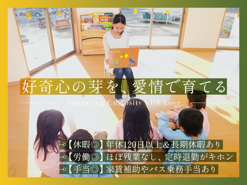 仕事内容 ━━━━━━━━━━━━━━━━━ すくすく育つ子どもたちを 無理なく一緒に見守りませんか? ━━━━━━━━━━━━━━━━━ // お休みを満喫できるからこそ、 子どもたちとしっかり向き合える。 行事で土日出勤があっても振替休日は100%取得! ✅残業ほぼなし(持ち帰り仕事なし) ✅長期休暇あり ✅産休や育休制度も完備 \\ 【 仕事内容はこちら 】 日中は子どもたちと一緒に過ごし、 子どもたちの帰宅後は保育室の掃除や 保育日誌の記録、翌日の準備などを行います。 年長児の体験活動である田植え など 様々な教育プログラムを展開中。 当園で働くことで子どもたちの 多彩な表情を見ることができます! ≪ ほかにも… ≫ ・外国人講師による英語教育(週1回) ・専門講師による体育指導(週1回) ※外部講師の指導中も子どもたちが 集中できるようサポート(補助)を実施。