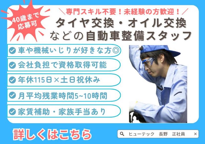 仕事内容 ◤ ̄ ̄ ̄ ̄ ̄ ̄ ̄ ̄ ̄ ̄ ̄ ̄ ̄ ̄ ̄ ̄ ̄◥ ヒューテックのサービススタッフとして お客様のカーライフに「安心」を届ける 自動車整備スタッフを募集! ◣_________________◢ ………⭐おすすめPOINT⭐……… ✅未経験でも安心のサポート! ”手に職”が可能! └資格取得支援制度あり◎ ✅車が好き・機械いじりが好きな方✨ ✅30代活躍中! ✅年休115日×土日祝休み ✅残業ほぼ無し/月平均残業時間5~10時間 ✅ワークライフバランス◎ ✅転勤なし◎地域に根差したお仕事 ✅家賃補助・寮社宅補助あり! ✅家族手当・育休・育児時短制度◎ ✅介護休暇・介護時短制度◎ ✅待遇・手当など充実 └詳細は“福利厚生”欄をcheck! ⭐仕事内容⭐  ̄ ̄ ̄ ̄ ̄ ̄ ̄ ̄ ̄ ̄ ̄ ̄ ̄ ̄ ̄ ̄ ̄ 株式会社ヒューテックの サービススタッフとして、 お客様のカーライフに安心を提供する、 自動車のタイヤ交換・オイル交換などの 基本的な整備業務をお任せします。 ⏩具体的には ……………………………………… ✅点検作業 └車検や定期点検など、自動車の安全確保と 環境保全のための点検を行います。 ✅部品交換作業 └オイル、タイヤ、消耗品などの 定期的な交換作業を行います。 ✅車の引き取り └サービスで車の引き取りも行っているため 指定の場所まで車を引き取りに伺います。 ✅お客様対応 └不具合のある車の状況を顧客から 聞き取り、点検結果や修理の必要性、 費用などを分かりやすく説明します。 専門知識は不要です! ✨個人車両整備もありますが、リース 事業があるので、整備を頼まれるのは リース車が多い傾向です。 ✨慣れてきたら代理店部門の車両販売・ リース・損保の業務も行っていきます。 ⭐未経験からでも安心⭐  ̄ ̄ ̄ ̄ ̄ ̄ ̄ ̄ ̄ ̄ ̄ ̄ ̄ ̄ ̄ ̄ ̄ ⏩当社では未経験の方でも安心して 働けるよう、先輩社員が丁寧に 指導します。 ⏩1対1で、最初は簡単な作業から スタートし、徐々に技術を身につけて いくことができます。 ⏩資格取得も会社が全面的に バックアップしますので、 自動車整備の知識や技術を 身につけながら、キャリアを形成して いくことができます。 ⭐入社後について⭐  ̄ ̄ ̄ ̄ ̄ ̄ ̄ ̄ ̄ ̄ ̄ ̄ ̄ ̄ ̄ ̄ ̄ ✨入社~1年ほど✨ 先輩が1対1で丁寧にサポートします。 最初は簡単な作業からスタートし、 徐々に1人でできるようになっていきます。 ✨入社1年後目安✨ 整備士資格取得にチャレンジ! 費用は会社で全面負担します。 合格率は60~80%なので 十分合格が可能です! 実際に未経験で入社し、整備士資格を取得 した方もいますので、安心してください♪ ╭━━━━━━━━━━━━━━━━╮ \✨長く働ける環境を整えています✨/ ╰━━━━v━━━━━━━━━━━╯ ☆ 努力や成長をしっかりと評価 └仕事や資格取得を頑張る意欲がUP! ☆ 個々のやり方や性格を尊重 └何事にも挑戦できる環境! ☆ 伸び伸びと仕事ができる職場 └様々な経験を積むことができます!