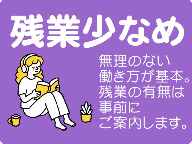 勤務時間 9:00~17:00(実働7時間/休憩60分間) 《 残業について 》 ・残業ほぼなし/月平均10時間未満