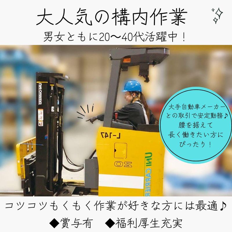 仕事内容 ⭐業務拡大のため増員募集⭐ 創業74年の老舗物流企業! 大手自動車メーカーとの取引で安心・安定♪ 【仕事内容】 物流倉庫でのお仕事です。 ▽入出荷などの倉庫業務▽ ◆ピッキング、梱包、伝票作業 ◆フォークリフト作業 納品される自動車部品を受け入れ・整理・管理などをお願いします☆ ✨年収400万円以上可能! ✨賞与年2回!(昨年実績4.25ヶ月) ✨充実の福利厚生! ✨退職金制度あり! ✨スキルはしっかり給与に還元! ✨定年60歳/65歳まで再雇用可能! 〈こんな方に!〉 ✅安定した企業で働きたい ✅スキルアップしたい ✅経験を活かして収入UPしたい 当社は徹底した品質管理や安全性 環境活動の推進、人材育成に力を 入れています。 「スキルや頑張りで評価されたい」 そんな方にピッタリのお仕事です! 【アクセス】 福田出張所 神奈川県大和市柳橋5-15-1 ◆小田急江ノ島線「桜ヶ丘駅」徒歩20分 ◆その他、大和や海老名駅、 中央林間駅などからも車通勤可能! ⭐車・バイク・自転車通勤OK※月額駐車場代は会社負担‼ 【その他】 ✅正社員雇用となりますので就業先の 異動もございます。 ⇒原則 神奈川県(藤沢市・寒川町) ✅生産計画により土曜勤務がある場合があります。 ✅勤務先によっては1週間毎の2直2交代制を 採用している拠点もごさいますので 予めご承知おきください。