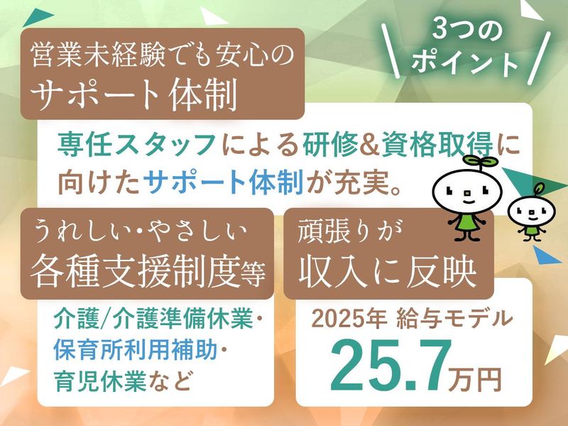 求めている人材 \未経験大歓迎!/ 専門知識がなくても大丈夫◎ 手厚いサポートで安心してスタートできます! 営業経験がない方や ブランクのある方も 安心してご応募ください! ☆ミドル世代活躍中☆ 家庭と両立する主婦(主夫)さんが多数在籍しています! 【必須条件】 ✅高卒以上 【歓迎条件】 ✅接客や販売など人と接する仕事の経験がある方 ✅子育てや家事と両立しながら働きたい方 ✅コミュニケーションを大切にできる方 ✅自転車の運転ができる方 【こんな方にオススメ】 ・ブランクがあってもOK ・第二のキャリアを築きたい方 ・人の役に立つ仕事に興味がある方 ・家庭と仕事を両立したい方 ・誰かを支えたいと思う気持ちがある方 ・新しいことにチャレンジしたい方 ・人生経験を活かしたい人 年齢の条件と理由:あり(例外事由1号・60歳未満(定年のため) ※再雇用制度あり)