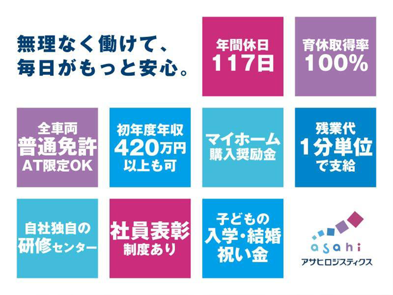 選考プロセス <最後までお読みいただきありがとうございます!> できるだけ多くの方とお会いしたいと考えていますので、少しでも興味をお持ちいただけましたらお気軽にご応募ください。 【ネット応募】 この求人の [ 応募する ] よりお願いします! もっと情報を知りたい!という方は以下サイトURLからご確認ください。 【会社ホームページ】 https://www.asahilogistics.co.jp/