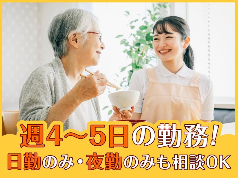 職場環境 看護師が24時間常駐。 充実した研修とOJTで 未経験・ブランクのある方も安心。 40代・50代の主婦さんが多数活躍中で、 和やかで温かい職場です。