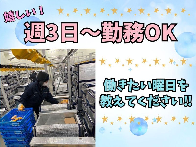 仕事内容 ////////////// 高時給1350円×昇給あり💰 未経験OKのカンタン軽作業♪ 時間帯選べて週3日~OK✨ ////////////// 12時or17時スタート⭐時間帯を選んで固定勤務もOK! プライベートと仕事のメリハリをしっかりつけられる! 冷凍倉庫内で食品を扱った軽作業をお任せ! ◇仕分け・ピッキング ◇検品・品出し ◇積み込み・積み下ろし ◇入出庫管理・倉庫管理 など コンビニやスーパーなどへ配送するアイスクリームや冷凍食品なので、重たいものは少なめ◎ 機械の指示通りに箱に詰めたり、数量を確認するだけなので難しい業務なし◎ 冷凍倉庫内での作業ですが、防寒対策は万全!こまめに休憩も取れるので快適に働けます♪ 「動きのある仕事のほうが好き!」「人と接する機会が少ない仕事がいい!」そんな方にピッタリのコツもく作業です★ \\ココが推し!// ⭐ライフスタイルに合わせた働き方が叶う♪ ①12:00~20:00 ②12:00~18:00 ③17:00~22:00 いずれもお昼・夕方スタート! 固定勤務可能で予定も立てやすい◎ 午前中は家事やプライベートに時間を使えます! 早起きが苦手…な方にもおすすめです♪ ⭐未経験でも安心♪ 軽作業デビューやブランクがあってもOK! 未経験スタートの先輩も多数活躍中です◎ ⭐体を動かしてスッキリ♪ ずっと座りっぱなしの作業は退屈という方にも! 運動不足も解消できちゃうお仕事です★ ⭐昇給あり♪ 仕事の習熟度により時給UPあり! 頑張りはしっかり評価します◎