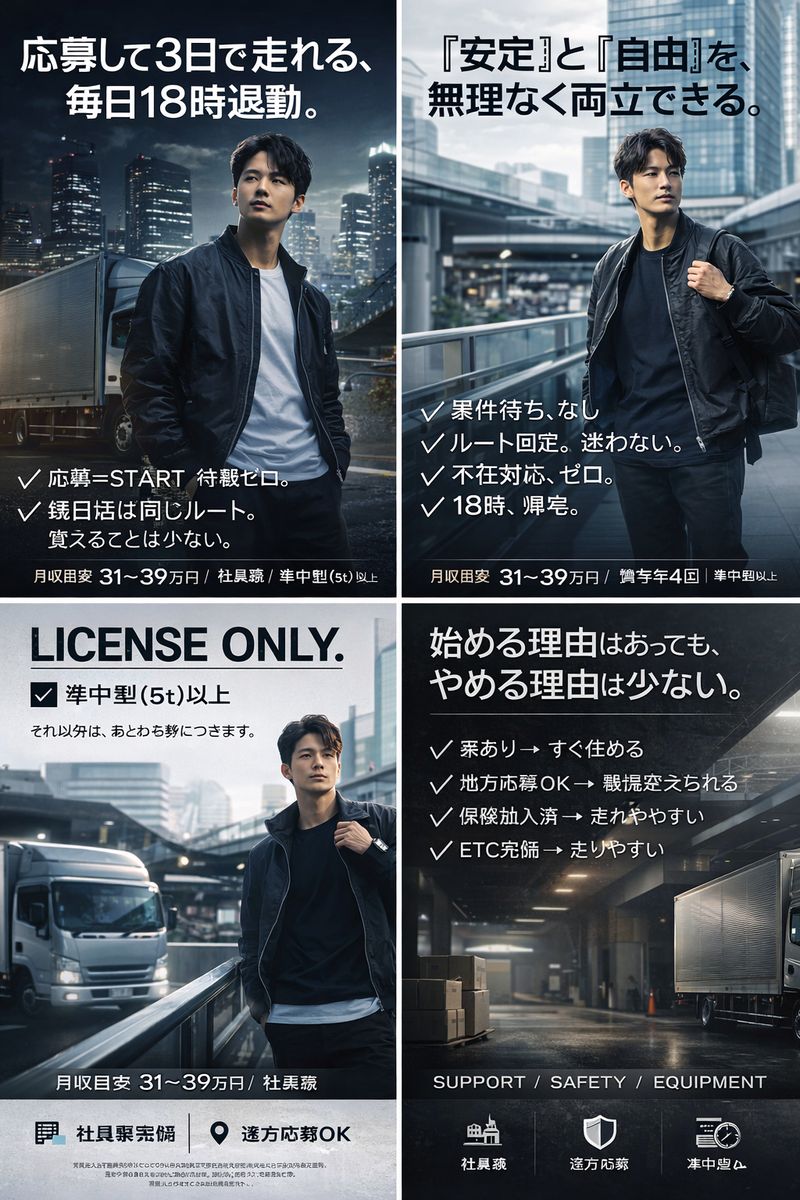 仕事内容: WORK STYLE 待機なし。 案件ガチャなし。 “登録だけして終わり”もない。 ここは、 最初から走る場所が決まっている仕事。 応募したら、動き出す。 シンプルです。 WHAT YOU DO 扱うのは大手酒類メーカーの商品。 配送先は卸業者のみ。 ✔ 個人宅なし ✔ 再配達なし ✔ ルート固定 ✔ 毎日ほぼ同じ流れ 覚えることは多くない。 慣れれば、自分のペースで回せます。 DAILY FLOW 7:45 START 8:45 DELIVERY 18:00 FINISH 夕方にはオフ。 夜はジムに行くもよし。 友達とご飯もよし。 副業もよし。 時間をコントロールできる仕事です。 MONEY 正社員雇用。 月収39万円以上も可能。 「稼げるけど不安定」じゃない。 「安定していて、ちゃんと稼げる」。 LICENSE 準中型(5t)以上でOK。 ATも相談可。 未経験スタートが9割。 今いるメンバーも、元飲食・元軽貨物・元タクシー。 特別な才能はいりません。 CHOOSE 夜遅くまで働くか。 安定して夕方に帰るか。 待ち続ける働き方か。 すぐ動ける働き方か。 選ぶのは、キミ。 まずは話だけでもOK。 最短3日でスタート可能。