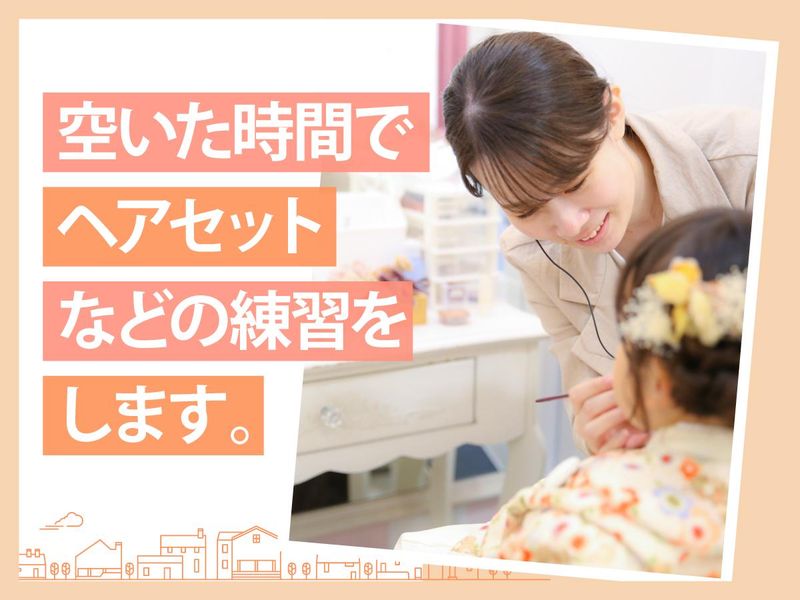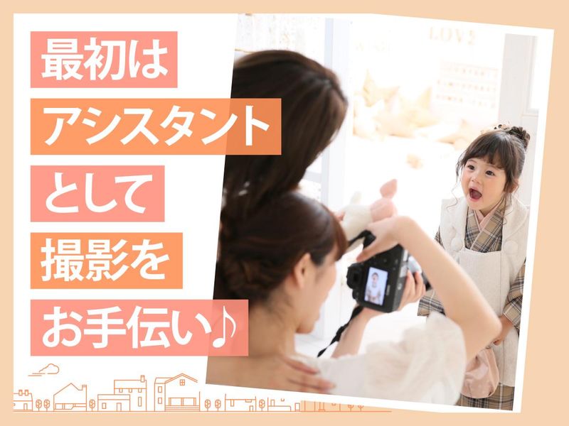 仕事内容 ✨笑顔あふれるフォトスタジオで 受付・接客スタッフ大募集✨ ・週2日~土日祝勤務できる方歓迎 ・シフトは3時間~6時間程度/短時間も歓迎 -お仕事見学・体験会開催中!- 実際の業務を見て、体験してから応募できるので、初めての仕事でも安心! 気軽に参加して実際の雰囲気を感じてください♪ - 事前予約にて ご案内する組数を調整しているので、 落ち着いた環境でお客様との 時間を大切にできます。 未経験でも安心スタート♪ - ● 未経験OK!主婦さん&学生さん活躍中♪ ● お子さまの“最高の一瞬”をつくるお仕事! 「子どもが好き!」 「かわいい衣装や写真に興味がある!」 そんな方にぴったりのお仕事です♪ ■お仕事内容 フォトスタジオで、 お客様の受付や 撮影のお手伝いをお願いします! ★ 受付・ご案内 ・ご来店されたお客様の受付&プランの確認 ・追加プランのご提案 ★ 衣装選び&ヘアセット ・お子さまと一緒にお気に入りの衣装を選ぶ♪ ・簡単なヘアセット&着付け ヘアセットはカタログから選んでいただくので 人気のヘアスタイルから覚えていきます♪ つけ毛やホットカーラーを 使ったアレンジがほとんど☆ ★ 撮影アシスタント ・緊張しているお子さまを笑顔に! おもちゃや声かけで楽しい雰囲気作り♪ ・慣れてきたら撮影もお任せ! プロの撮影技術も学べます✨ ・動画撮影サービスも新たにスタートしました♪ \未経験でも大丈夫!安心のサポート体制/ ✅ 最初は先輩スタッフがしっかりサポート! ✅ 動画やウィッグを使ったヘアセット練習あり! 1ヶ月程度で覚えられます♪ ✅ 着付けは簡単な「飾り帯」が 多いので安心! ●このお仕事で得られるスキル● ・お子さまのかわいいヘアアレンジができるようになる! ・写真の撮り方やカメラの知識が身につく! ・接客スキルUP!人と接するのがもっと楽しくなる♪ 主婦さんからは「子どもの髪型をかわいくできるようになった!」 「写真の撮り方が上手くなった!」と大好評です✨