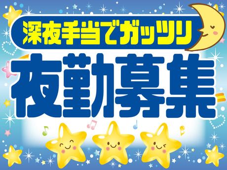 勤務時間 <夜勤固定> (1)18:00~翌3:10 (2)19:00~翌4:10 (3)20:00~翌5:10 (実働8h/休憩70分) └勤務シフトは上記以外にも 色んなパターンがありますので 「●●時からが希望」など お気軽に相談してくださいね。 ※他、日勤専属や2交替もあるので お気軽にご相談下さいね。