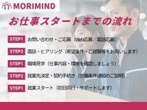 選考手順 ◆WEB応募の場合 「応募する」ボタンからご応募下さい。24時間いつでもOK!応募情報のみの入力でかまいません。 ◆電話応募はさらにカンタン 応募受付TEL 0228-24-8447 (月~金/午前8:30~午後6:84) ※祝日可 面接地 ◆出張面接可能 ◆WEB面接始もOK ご希望の方は、お気軽にご相談ください。 ◆株式会社モリマインド 宮城県栗原市築館青野8-10 TEL 0228-24-8447