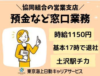 仕事の内容 \あなたの笑顔でお出迎え/ ◆対面対応お得意な方にピッタリ♪ ◆ほぼ17時定時で退社! ◆マイカー通勤OK@土沢駅チカ 【基本情報】 雇用形態:派遣社員 雇用期間:長期(3カ月以上) 26年1月~開始日相談可能 就業時間:8:30~17:00(休憩60分) 【必須条件】 ◆パソコン:基本操作(入力~修正) 【お仕事内容】 ・窓口業務 ・貯金受払 ・国内為替業務 ・お客様問合わせ対応 ・データ入力 ・電話対応など ◆銀行ご経験者、歓迎デス♪ 【環境面等】 ・18名在籍!協同組合の営業支店でのご勤務です ・20代・30代・40代・50代の多い職場 └幅広い年代活躍中/子育てに理解ある主婦(夫)が活躍中 ・制服貸与 └更衣室あり!通勤時は自由な服装で♪ 【福利厚生等】 ・ランチタイムは休憩スペース利用OK └お弁当持参OKです ・ベネフィット・ステーション ・社会保険完備 ・定期健康診断あり ・車通勤OK ・禁煙オフィス!煙苦手な方も安心 ・平日のみOK!土日祝休み ・年間休日120日以上&お休み相談可 └有給休暇 ○●嬉しいPOINTたくさん!●○ 履歴書不要!開始日相談/長期/主婦・主夫活躍中/子育てに理解のある職場/ブランクOK/社保完備/残業月5時間以内/17時退社/7.5時間以内勤務