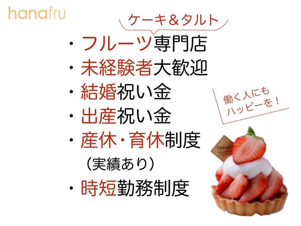 仕事内容 季節を感じながら、 フルーツ専門店で 働きませんか?  ̄ ̄ ̄ ̄ ̄ ̄ ̄ ̄ ̄ ̄ ̄ ̄ ̄ ̄ ショーケースのなかに、季節を感じることができる「ハナフル」のお仕事。 / 毎日の食卓に、 フルーツのある生活を。 \ を理念に<カフェ「FRUiT」><オンラインストア>、そして、<ギフトフルーツやケーキ・タルトの「hanafru」>を手がけてきました。 今回は、ギフトフルーツやケーキ・タルトの「hanafru」のスタッフ募集です。 ケーキ大好きな人はもちろんですが、くだもの大好き。「もっとくだものに詳しくなりたい」というあなたにピッタリのお仕事です。 ギフトコーナーや、ショーケースのなかに、旬のくだものや、そのくだものをふんだんに使用したケーキやタルトがならぶ。色どりも鮮やかで、季節を感じながら、できるお仕事です。 ちなみに、もうすぐ春。春はいちごや、日向夏などの柑橘類がおいしくなります。 おいしいだけじゃありません。 / 季節のフルーツを味わうことは、 自然と調和すること。 \ その時期に実る果実には、私たちの体を整える力が詰まっています。 たとえば、いちごは、 冬から春へと移ろう季節に、体を内側からやさしく整えてくれます。 ビタミンCをはじめとする栄養を豊富に含み、 寒さや環境の変化で揺らぎやすい時期の心と体に、やさしく働きかけてくれます。 だから、旬のくだものを食べると、 五感が喜び、心も満たされてくのでしょう。 販売だけじゃなく、お店の運営もお任せしていきます。 ちょっと素敵なお店づくりを、いっしょに始めましょう。 そして、喜びと満足を多くのお客様に! 提供していきましょう。 //////////// 仕事内容 //////////// フルーツ専門店「ハナフル」の販売スタッフとして勤務いただきます。 今回の勤務地は「松坂屋 名古屋店」です。 具体的には、 ・ケーキ・タルトの販売 ・フルーツギフトなど、フルーツの販売 です。 【 ✨食べごろはいつ?✨ 】 フルーツの旬や知識、季節ごとの特徴を学びながら働けます。興味をもった方には産地見学も実施しています。糖度だけでなく、追熟の方法や、食べごろのご案内などができるようになれば、仕事は益々、面白くなります。 【 ✨はじめはサポートから✨ 】 店長をサポートしながら、店舗の運営方法、アルバイトスタッフの管理方法を学びます。少しずつでOKです。発注・販売・人材の管理など、できるようになれば、新店の店長などに抜擢させていただきます。 【 ✨SNSでマーケティング!✨ 】 公式のインスタだけではなく、各店舗でもインスタを配信しています。旬のフルーツや、今なら春の新作スイーツなどをアップし、来店を促していきましょう。ちょっとコピーライター気分も味わえます♪ オススメしたくなる、美味しいもので一杯です。 ※2025年のクリスマス。みんなでSNSの発信などを頑張った結果、全店舗合計で、売上160%を達成! サンタさんからいいプレゼンをいただいた気分でした! 【 ✨楽しみな試食会✨ 】 新作の試食会にも参加します。お客様にいちばんちかいあなたのアイデア・意見に期待しています。お客様からの声をダイレクトに届けてもらうことで、お一人様用にも選びやすいカットタルトやケーキなどが生まれました。