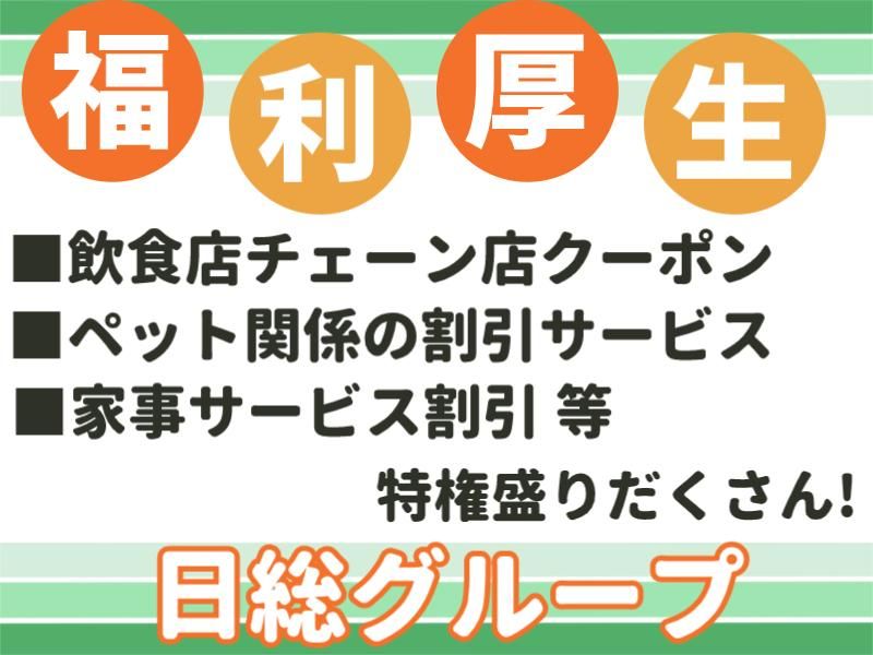 【保険制度】 雇用保険、労災保険、健康保険、厚生年金 待遇・福利厚生 【福利厚生】 交通費別途支給 慶弔休暇制度 半休制度あり 有給休暇(入社2ヶ月後から使用可) 休憩室・個人ロッカー完備 冷暖房完備 制服/保護具貸与 駐車場あり(無償) 室内・敷地内原則禁煙(喫煙所あり) 友人紹介制度あり 教育制度あり(研修制度充実) 正社員(派遣元)登用制度あり 資格取得支援制度あり ※各種規定あり 【副業OK(申請制)】 弊社が本業で仕事終わりや休日に副業を する事は可能です! 但し、事前申請制で弊社の就業規則が ありますので、ご希望の方はご相談ください。 【日総グループ福利厚生サービス使用可能】 旅行やグルメ、映画にショッピングなど、 娯楽に関する特典盛りだくさん! それ以外にも学習やライフサポートに関する 特典もあるので安心♪ <例> ★テーマパークや宿泊施設の割引 ★飲食チェーン店クーポン ★家事サービス割引 ★ペット関係のサービス割引