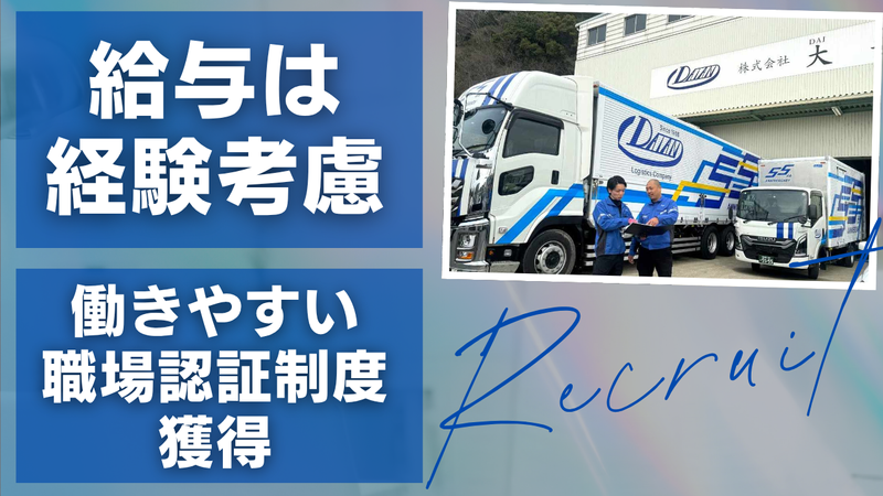 仕事内容 <この求人のポイント>  ̄ ̄ ̄ ̄ ̄ ̄ ̄ ̄ ̄ ̄ ̄ ̄ ̄ ̄ ̄ ̄ ̄ ̄ ✅歩合制度、各種手当など給与サポートもバッチリ! ✅全営業所で「働きやすい職場認証制度」も認証取得済み ✅福岡県内を中心とした近距離の集配業務 ✅GW / 夏季 / 年末年始休暇などの大型連休もあり!  ̄ ̄ ̄ ̄ ̄ ̄ ̄ ̄ ̄ ̄ ̄ ̄ ̄ ̄ ̄ ̄ ̄ ̄ ⭐業務内容  ̄ ̄ ̄ ̄ ̄ ̄ ̄ ̄ ̄ ̄ ̄ ̄ ̄ ̄ ̄ ̄ ̄ ̄ 2t車による「一般雑貨」の集配業務をお願いします。 エリア:福岡市内を中心とした集配業務(1日7~9件程度) 座学から横乗り研修、実技研修、フォークリフト研修など活躍いただくためのサポートが充実しています。 1チーム約10名体制なので「休みの対応」や「積み込み作業の効率化」などフォロー体制が整っています。固定のエリアをお任せするので、一度慣れると効率にお仕事ができますよ。 ⭐株式会社大安とは?  ̄ ̄ ̄ ̄ ̄ ̄ ̄ ̄ ̄ ̄ ̄ ̄ ̄ ̄ ̄ ̄ ̄ ̄ 設立55年以上の歴史ある企業です。 1968年設立の当社は「Gマーク取得」はもちろん、全営業所で「働きやすい職場認証制度」も認証取得済みの企業です。 事業基盤がしっかりしているため常に安定した仕事量もあり、現在も事業拡大に向けドライバーさんを増員しております。 あくまでも事業拡大が従業員に負担の掛からないように行っております。 弊社ではご年齢や体力に合わせて、手積み以外の仕事にシフトしたりなど従業員の健康を考えた体制作りを行っております。 今後の体力面で不安を感じる方もお気軽にご相談ください。 ⭐それぞれに合ったキャリアをご用意  ̄ ̄ ̄ ̄ ̄ ̄ ̄ ̄ ̄ ̄ ̄ ̄ ̄ ̄ ̄ ̄ ̄ ̄ ドライバーからスタートしますが、その先は人それぞれです。 ドライバーとして高みをめざす人なら、運転可能な車両を増やし、スペシャリストへと成長できますし、管理者志望の人には、お客様との折衝や配車手配を行う業務や営業所の所長をめざすコースを用意。 将来は複数の営業所を管理する部長職や子会社化して社長をめざすなど、自分らしい未来を創造することができます。 ⭐『イキイキ・ニコニコ・ワクワク』がテーマ  ̄ ̄ ̄ ̄ ̄ ̄ ̄ ̄ ̄ ̄ ̄ ̄ ̄ ̄ ̄ ̄ ̄ ̄ 「せっかくなら楽しく仕事しよう」と、社内では和気あいあいとした明るい雰囲気を大切にしています。 1日運転して疲れて事務所に戻った時、職場の雰囲気が良くなければ、さらにイヤな気分になってしまうと思います。 もし、1日の中で相談したい件があっても上司に言いづらい職場だと仕事にも響くでしょう。 プライベートで嫌なことがあっても、出勤すれば明るい気持ちになれるよう、外出先で大変なことがあっても、社に戻ればリセットできるよう、『イキイキ・ニコニコ・ワクワク』できる職場でありたいと考えています。