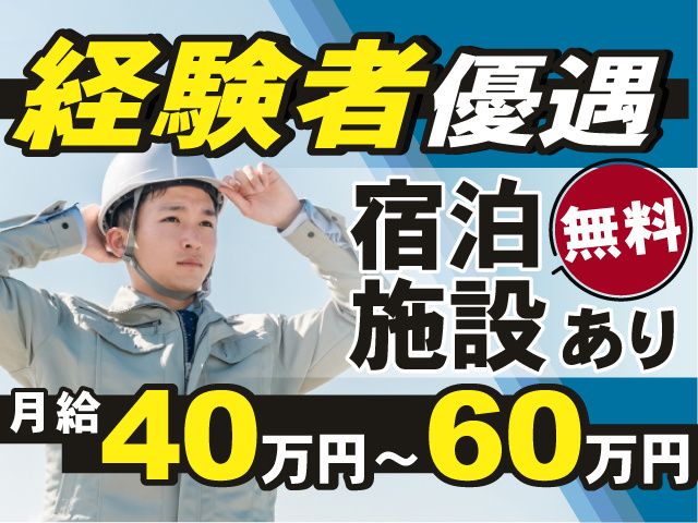 【保険制度】 雇用保険、労災保険、健康保険、厚生年金 待遇 ◆社会保険完備 ◆無料宿泊施設あり ◆各種手当支給 ◆交通費支給 ◆作業着・装備品貸与