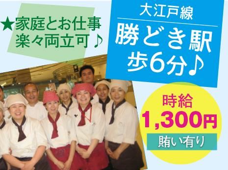 仕事内容 \働く方に楽しい食事を/ 安心の大手企業内/社員専用食堂♪ 昨夏新規オープンしたばかり♪ 最新設備整うキレイでアットホームな社員食堂で働いてみませんか! 【勤務地】 大江戸線「勝どき駅」徒歩6分 有楽町線「月島駅」徒歩12分 (東京都中央区晴海3丁目) ♥調理補助スタッフさん! 未経験大歓迎♪親切指導で安心♪ 20~63歳!主婦・女性活躍中! 【具体的には】 ・昼食等の調理補助 (主に定食・麺類・小鉢・軽食等) ・盛付け、提供等 【勤務時間・曜日】 11:00~14:00/3h ★月~金曜内で週3日 (シフト曜日は応相談) ♥ゆとりの勤務も大人気! 【休日・休暇】 土・日・祝日・GW・年末年始 他、企業カレンダーによる休み有! ★年間休日120日以上でオフも充実♪ (お子様のいらっしゃる方にも大好評) 【社員食堂で働くメリット】 ✅働き易く安定した勤務時間♪ 社員食堂は企業の営業時間等に合わせて運営されており、中でも平日のランチタイムが中心です♪ ✅お客様は常連(社員やスタッフさん等) 社員食堂のお客様はその企業で働く社員やスタッフさん等がほとんどなので、とてもアットホームな環境です♪笑顔いっぱいの「美味しかったよ~」「ごちそうさま」も大きなやりがいです ✅嬉しい食事補助(美味しい賄いあり) 昼食代の節約&お弁当の手間も不要♪ ✅ご家庭での調理にも役立つスキル♪ 調理方法や衛生管理の知識もゲット! ✅他、飲食業等とは異なる休日♪ 各企業等の休日と合わせる社員食堂がほとんどなので、土・日・祝日やGW・年末年始休暇があるのも人気の理由。 【当社概要】 ・企業事業所給食/首都圏約200店舗 ・ISO14001取得