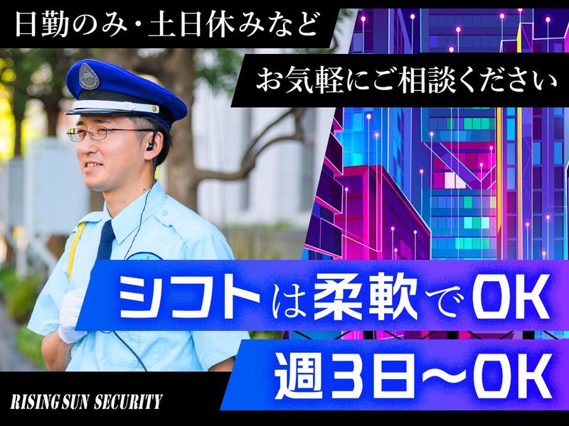 職場環境 創業から40年、官公庁を始め、大型商業施設やホテル、工場など、数多くの企業から警備依頼が舞い込む「株式会社ライジングサンセキュリティーサービス」 お客様に安全・安心を提供しています。 今回、新たに50名以上の積極採用!あなたも警備のプロを目指しませんか。