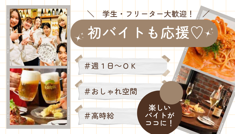 求めている人材 ■飲食業に興味があれば、未経験の方も大歓迎! <こんな経験が活かせます!> 飲食店でのアルバイト・パート経験 レストランやカフェでの調理・調理補助・厨房経験 サービス業での接客経験 <こんな方にピッタリ!> 明るく元気な対応ができる方 飲食店や居酒屋が好きな方 コミュニケーションが得意な方 チームワークを大切にできる方