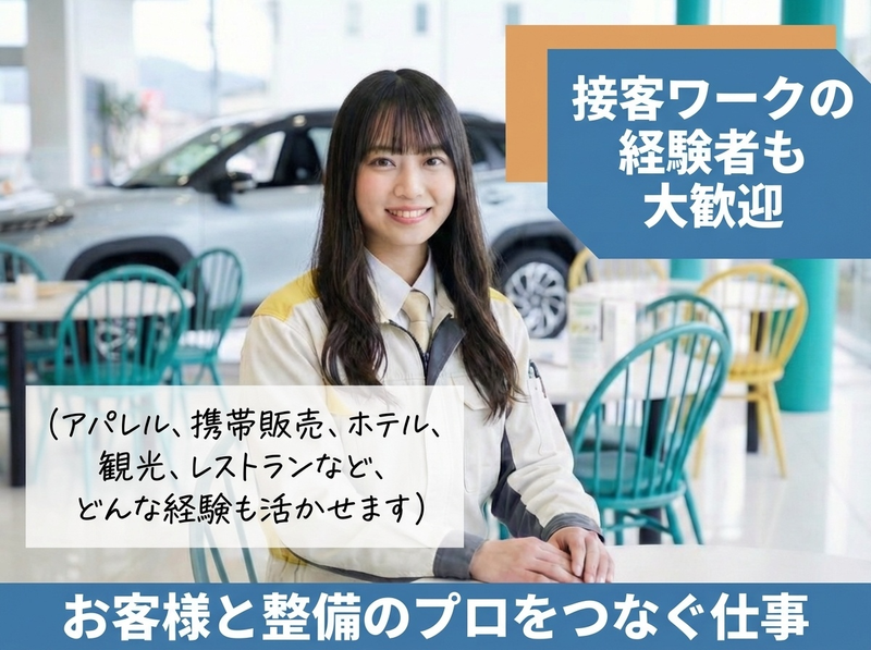 求めている人材 ◆要普通自動車免許 ※入社後にAT限定解除可能 ◆未経験からのチャレンジ歓迎 ◆年齢不問、20代・30代活躍中 40代・50代の中高年も活躍中 ◆学歴不問、既卒歓迎、転職回数不問 ◆子育て世代歓迎! ◆転勤なし・出張なしの仕事 \ こんな方は尚歓迎 / ●コミュニケーションを大切にできる方 ●明るく前向きに仕事に取り組める方 ●サービスフロントや受付経験者、 整備士経験者 《 こんなワードで探している方も歓迎 》 受付、企業受付、受付事務、観光案内、 自動車整備士、カーディーラー、 自動車工場、受付案内、医療事務、 官公庁事務、サービススタッフ、 営業、サービスフロント、 インフォメーション など 《 職場環境について 》 ◇定着率が高い職場 ◇子育て世代応援、連続休暇取得可能 ◇直行直帰可能、出張なし