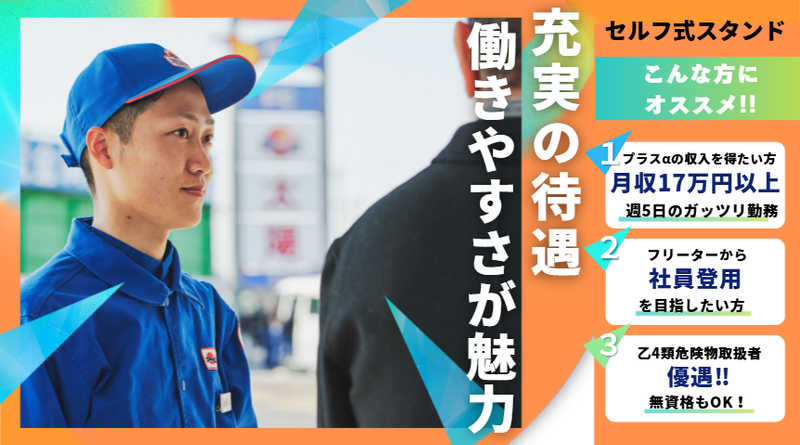 求めている人材 ☆未経験大歓迎!! ☆フリーターさん・Wワーカーさん活躍中 ☆経験者歓迎 ☆危険物乙4類保持者優遇 免許取得の社内研修あり!月に1度、3日間の合宿/誰でも無料参加可能 / こんな方も活躍中です! \ ★フルタイムでガッツリ働くフリーターさん ★本業と両立しながら週2日で働くWワーカーさん ★カフェ・喫茶店・レストラン・居酒屋・ファミレスなど飲食店や、アパレル・雑貨店・家電量販店などでの接客経験をお持ちの方 ★コミュニケーションをとる事が好きな方 ★車が好きな方