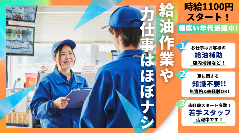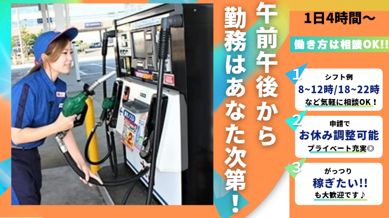 【保険制度】 雇用保険、労災保険、健康保険、厚生年金 待遇・福利厚生 【福利厚生】 <充実の待遇&働きやすさが魅力> ◎社会保険完備(法令に則り適用) ◎昇給あり ◎交通費支給(規定) ◎社員登用制度あり ◎制服貸与 ◎土日祝の勤務インセンティブあり (1時間につき100円支給) ◎着替手当有(着替え時間にも手当支給) ◎資格取得支援制度あり(乙4類危険物) ◎Wワーク可(※1ヵ月30時間まで) ◎マイカー通勤OK/駐車場完備