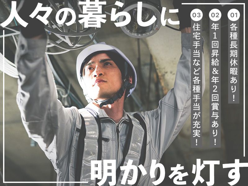 仕事内容 …求人のPOINT………………………… ✅実働7時間で働きやすい! ✅各種長期休暇あり! ✅年1回昇給&年2回賞与あり! ✅住宅手当など各種手当が充実! ✅資格取得支援制度あり! …………………………………………… 【仕事内容】 電気工事全般をお任せ! 新築工事を中心に、改修工事や街灯工事、 防犯カメラ工事なども対応します。 >>具体的には…? □新築の一般住宅やマンション、 倉庫や店舗などの電気配線工事 □高圧受電設備工事 □施設や店舗などの改修工事 □街灯工事・外構工事・防犯カメラ工事 など <そのほかの詳細情報> *対応エリア/関東一円~大阪まで *出張(宿泊込み)/年1回程度 *対応人数/1現場につき2~4名 ⇒基本的に社長や先輩と一緒です。 慣れてきたら、現場によっては 1名で対応することもあります。