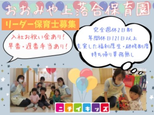 【Point オススメポイント】 「ニチイキッズおおみや上落合保育園」は大宮駅西口徒歩12分程にある ホームズさいたま中央店の2階にあります♪ 0歳児~2歳児36名定員の保育園となっており、 毎日子ども達と保育士の笑顔や笑い声がいっぱいの保育園♪ 広々とした廊下、お部屋に大きな窓があり、 太陽の光が差し込む常に明るい雰囲気の保育園です☆ これまでの経験を活かして、リーダー保育士として活躍してみませんか? ◆JR大宮駅から徒歩12分程。 ◇職員同士の仲も良く、雰囲気良好です! ◆年間休日121日以上!家庭との両立可能です。 ◇完全週休2日制! ◆持ち帰り仕事なしでプライベートも充実! 【仕事持ち帰りゼロへの取り組み】 園全体で協力して仕事持ち帰りゼロを目指しています。 ひとりで抱えることなく話し合いながら進めます。 いつもスタッフで話し合ったり、声をかけ合ったり、協力し合える環境を作ることで、 持ち帰り仕事ゼロ・残業時間の削減を目指し取り組んでいます。 まずはぜひ一度園見学に来てみませんか♪ 【入社お祝い金について】 以下の条件を満たす方を対象に、最大20万円の入社お祝い金を支給! ①保育士経験が2年以下の方:5万円 ②保育士経験が2年以上の方:10万円 ③保育士経験が2年以下で引越費用実費補助制度(※)を活用して入社する方:10万円 ④保育士経験が2年以上で引越費用実費補助制度(※)を活用して入社する方:20万円 ※実家等の現住居から勤務予定地まで片道2時間以上の通勤時間がかかり、 転居を伴う引越が必要な方を対象に、引越に係る費用を補助する制度(上限30万円) ※その他支給にあたり当社規定あり。お気軽にお尋ねください♪ 【Message 採用担当者より】 残業ほぼ無し!希望休も99%通ります。 持ち帰り仕事もありません! 職員同士協力・助け合いの環境がありますので、 有休や希望休も取りやすく、 仕事とプライベートにメリハリある仕事ができる環境です。 明るく優しいスタッフがお待ちしています。 是非、これまでのご経験をご発揮いただければと思います。 お気軽に見学にお越しください! 【園長先生からのメッセージ】 大宮駅から徒歩12分、365日年中無休の保育園です。 ホームセンターの2階にあり、お部屋は窓が大きいので、 とても明るく開放感があります。 お天気の良い日は、近隣の公園に行き砂場や遊具等で遊んでます。 また、お散歩のときには新幹線を見るのも子ども達の楽しみの一つです。 職員自身も元気な子ども達に負けないように「おもいっきり」学んで遊びます♪ 敷地内に広場がありプランターを使って春はチューリップ、 夏は野菜を育てて収穫を楽しみにしております。 職員は20代前半から50代まで幅広く、 お互いに個性を大切にしながら、ワンチームになり子ども達を支援しております。 まずはぜひ、保育園に来てみてください♪ ★ハローワークからの方も、こちらよりご応募ください★ 【採用連絡先】ニチイ学館 関東第三支部 人材課 TEL:048-644-6474(平日9:00~17:15) 【新型コロナウイルス対策について】 面接および保育園見学の実施に際しては、マスクの着用、換気、消毒など 感染症予防に努めておりますので、安心してお越しください。 なお、ご参加いただく際にはマスク着用等、感染防止対策にご協力をお願いいたします。