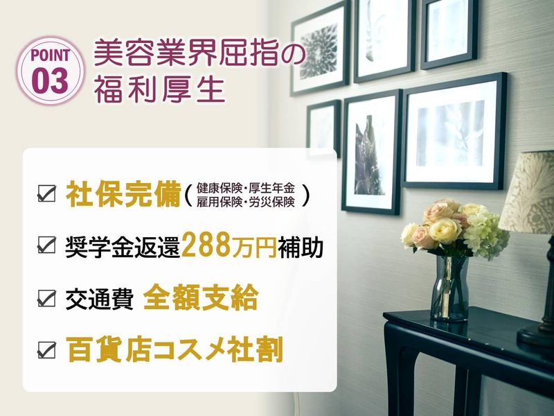 選考プロセス //////////////////////////////////////// <応募方法> 応募氏名、メールアドレス、 電話番号等を入力して簡単応募。 //////////////////////////////////////// 【入社までの流れ】 1ご応募 2Web面接 (新卒の方は対面で面接を行います) 3内定 4入社 ※ご希望に応じてサロン見学や カジュアルWeb面談も承ります。 ※入社日はご相談に応じます。 ・職場見学可 ・面接1回