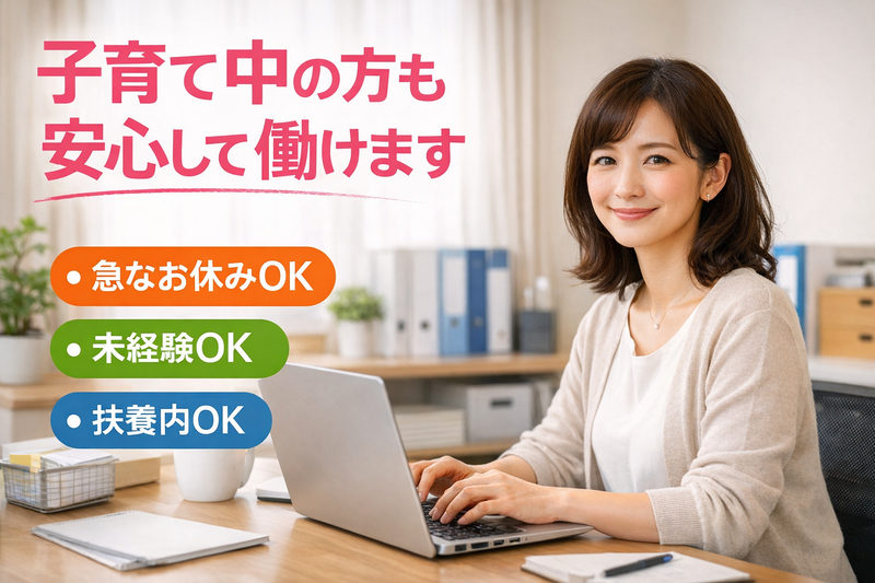 アピールポイント: 働きやすさを最優先にした職場です ・9:00〜17:00の間で1日3時間〜OK 自由度が高いです ・平日のみ ・残業ゼロ ・忙しくありません ・扶養内OK ・当日欠勤OK 家庭を優先して働けます。 子どもの発熱、学校行事… 遠慮なく休んでください。 本当に理解のある職場です。 未経験でも大丈夫。 研修+いつでも質問できるサポートがあります。 「落ち着いた環境で長く働きたい」 そんな方をお待ちしています。