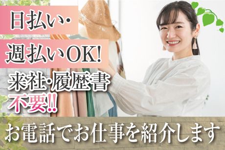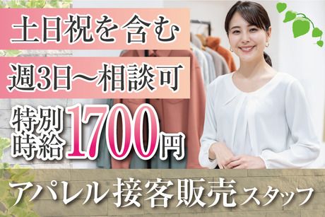 仕事内容 フェミニンで上品な女性向けアパレルブランドでの接客・店舗運営 百貨店内にあるアパレルショップで 接客・販売をお任せします。 <具体的には…> ・接客販売 ・お客様のコーディネート ・店内のディスプレイやレイアウト変更 ・商品選び ・売上管理 ・レジ など キャリアウーマンやヤングミセスを対象に 普段着からパーティドレスまで、さまざまな商品を展開。 トレンドを程よく取り入れ、 品質・生地など細部にこだわった MADE IN JAPANのアイテムを販売しています♪ ◆週3日~OK!ライフスタイルに合わせた働き方ができる◎ 勤務時間は早番・中番・遅番の3パターン。 週3日~の勤務なので、 プライベートと両立したい方にもピッタリ◎ 「週3日で家庭と両立したい」 「週5日のフルタイムでしっかり稼ぎたい」 「長期で安定して働きたい」 など、希望の働き方が叶います。 曜日固定や時短の働き方も相談可能ですよ! ◆未経験OK!20代~50代女性が活躍中! アパレル系のお仕事経験があれば優遇ですが、 未経験の方でももちろんOK◎ 百貨店内のショップのため、 ワンランク上の接客スキルが身に付きますよ! 初めて働く職場では、仕事の流れなど 何から進めればいいのか不安なこともあるかと思います。 一緒に勤務するスタッフがしっかりとお教えしますので ご安心ください! 「オシャレ、ファッションが好き」 「人と話すことが好き」 あなたの”好き”を活かしてご活躍いただけます◎ ◆来社&履歴書不要!電話でお仕事のご紹介が可能です。 今回募集しているお仕事に関して もっと詳しく説明してほしいと思われた方には、お電話でしっかり説明します。 来社&履歴書不要でお仕事のご案内が可能なので 仕事が休みの日や仕事終わりなど、 あなたの都合のよいタイミングで連絡いただければ希望のお仕事を案内しますので まずはご応募ください。
