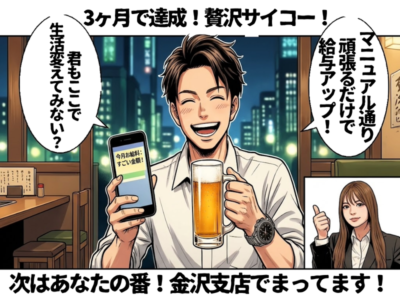 求めている人材 ●経験・年齢・学歴不問 ●業界未経験・資格不問 ●既卒・第二新卒・新卒歓迎 ●ブランク・UIターン歓迎 ●人と話すことが好きな方 ●ガッツリ稼ぎたい方 ●20〜30代の若手活躍中 ●営業経験者は即戦力! ●体育会系の出身者も多数! ●コスパ・タイパ重視の方 「とにかく稼ぎたい!」 そんな理由でOKです。 正当な評価がされない悩み、 当社で解決しませんか? 「結婚・マイホーム・起業」 あなたの夢を会社が全力で サポートします! 【当社でやれば】稼げます! 《 働いているスタッフは… 》 小松市、白山市、加賀市 (例えば…金沢駅・小松駅・粟津駅・松任駅・野々市駅周辺など) 車で20~40分以内が通勤エリアとなっています* ◆メンバーのMBTI診断結果は… ENFJ(主人公)、INTP(論理学者)、ENTJ(指揮官)など