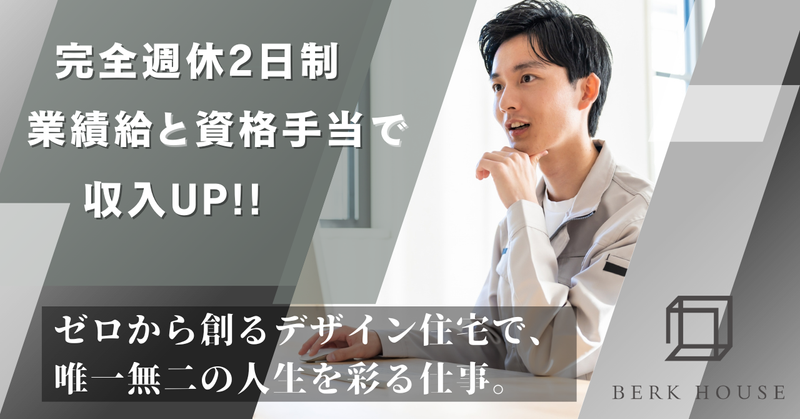 【保険制度】 雇用保険、労災保険、健康保険、厚生年金 待遇・福利厚生 【福利厚生】 <安心して長く働ける環境> □各種社会保険完備 □マイカー通勤可 □海外研修制度あり □退職金制度(勤続年数による) □プライベートジムあり(※自社内) ┗ 専属トレーナーから指導を受けることも可能 □健康診断 □保養所(弊社施工民泊施設)利用可能 <各種手当で社員をサポート> □交通費全額支給 □役職手当 □資格手当(例:宅地建物取引士/月1万円、一級建築士/月2万円 など) <頑張りを正当に評価する報酬制度> □ 昇給制度(随時) □ 決算賞与(業績による)