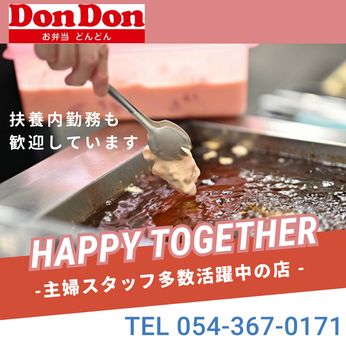その他 未経験OK、大学生歓迎、新卒・第二新卒歓迎、フリーター歓迎、主婦・主夫歓迎、午前のみOK、午後のみOK、短時間OK、長期歓迎、土日祝のみOK、週3日以内OK、週4日以上OK、時間や曜日、シフト制、昇給あり、賞与あり、社員登用あり、制服あり、車・バイク通勤OK、副業OK、髪型自由、履歴書不要、扶養内勤務OK、面接マスク着用、マスク支給、アルコール消毒液完備、パーテーション設置、50代以上応募可、40代以上応募可、週2・3日からOK、面接1回のみ、社割あり 【~こんな経験、前職が活かせる~】正社員として、飲食店ホール・接客・キッチン・洗い場業務をご経験されていたり、アパレル・百貨店・カフェなどで、接客販売のアルバイトをご経験されていたり、ドラッグストア・コンビニなどで、店長・リーダー・マネージャーの経験、スーパーでの弁当調理・調理補助や、食品加工などのパート勤務を、短時間勤務で働いていた方など、皆さん大歓迎。その他、営業や一般事務などの異業界経験者さんも多数活躍中。 【その他】【ここはお約束します】 未経験からのスタートもしっかりサポートします。 初日はじっくりと基本を学び、2日目からは店長や先輩と一緒に、お仕事をしながら段階を踏んで学べる環境です。 また、それぞれがプライベートも両立しながら働けるよう、シフトやお休みなどの相談には柔軟に対応しています。 学校や幼稚園の行事、お子さんの病気など気軽に相談して下さいね。 【ここは覚悟して来て下さい】 「どんどん」は新しいことに挑戦し続けているお店です。 なので「いつもと一緒」ではなく「進化を受け入れ、吸収する」ことができないと長く続けることは難しいかもしれません。 また、もちろん立ち仕事なので、お昼や夕方の混雑時は体力を消耗することもあるため、繁忙時も根気よくお仕事できる方、ガッツのある方を歓迎します。 【ブランド名】 どんどん 【事業内容】 持ち帰り弁当店「お弁当どんどん」の運営