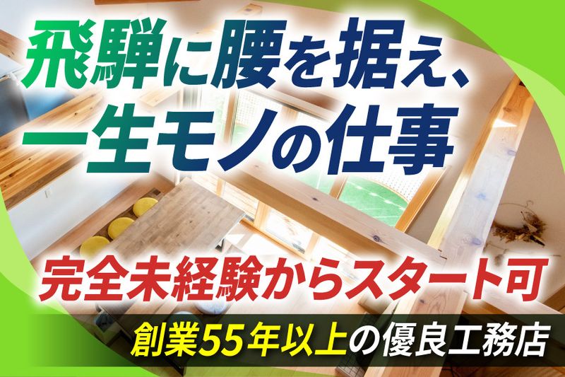 【アピールポイント】 【飛騨でずっと。家族とずっと。】 地元に根差した創業57年の優良工務店 ✅未経験からプロを目指せる ✅安定した仕事量 ✅完全週休2日制(土日) ✅社用車 社員寮完備(リフォーム済みの一軒家) お電話でのご応募もお待ちしています 0578-82-0709