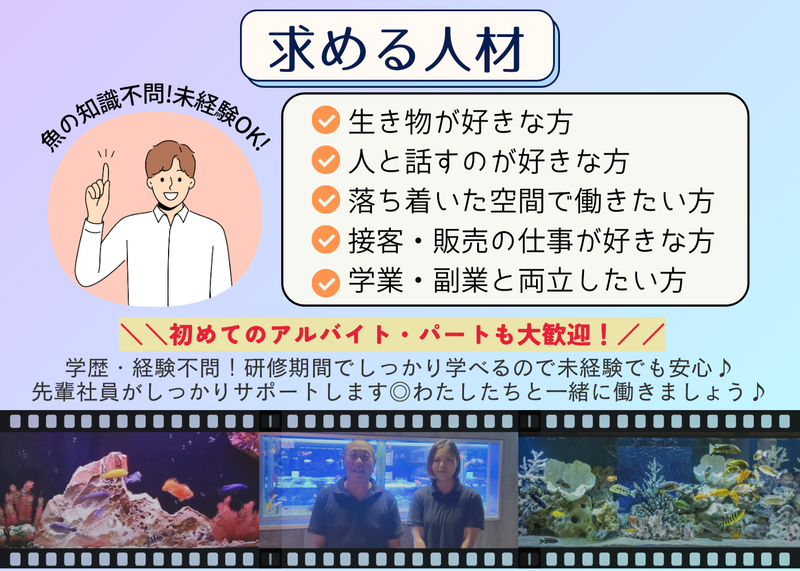 求めている人材 \\初めてのアルバイト・パートも大歓迎!// 学歴・経験不問!もちろん経験者の方も大歓迎! 研修期間でしっかり学べるので未経験でも活躍できます♪ ≪優遇条件≫ ・飼育経験がある方歓迎 ≪こんな方に◎≫ ◎魚や生き物が好きな方 ◎人と話すのが好きな方 ◎接客や販売の仕事が好き、または挑戦してみたい方 ◎落ち着いた空間で働きたい方 ◎未経験から新しいことを始めたい方 ◎学業・副業・プライベートに合わせて働きたい方 ◎午後からゆっくり働きたい方 ⏰お気軽にご応募ください⏰ 少しでも気になった方、ぜひ一度お話ししましょう! ご応募お待ちしております♪ 一緒に地域を盛り上げていきましょう!