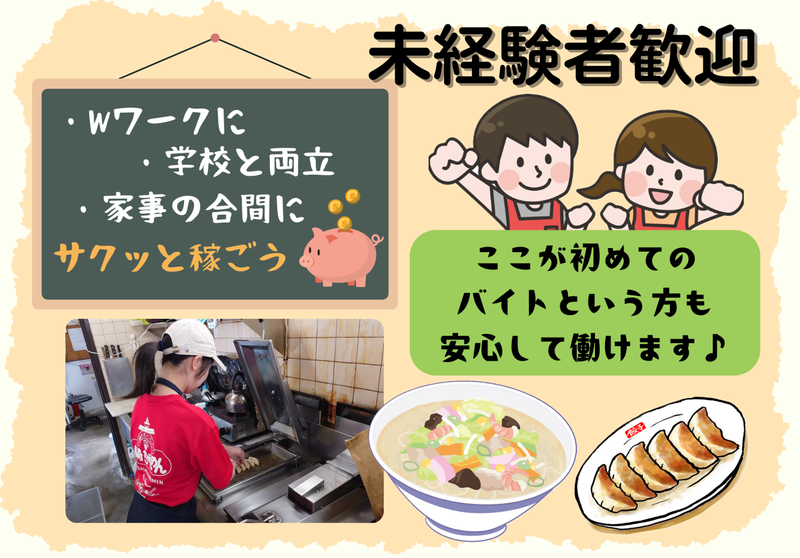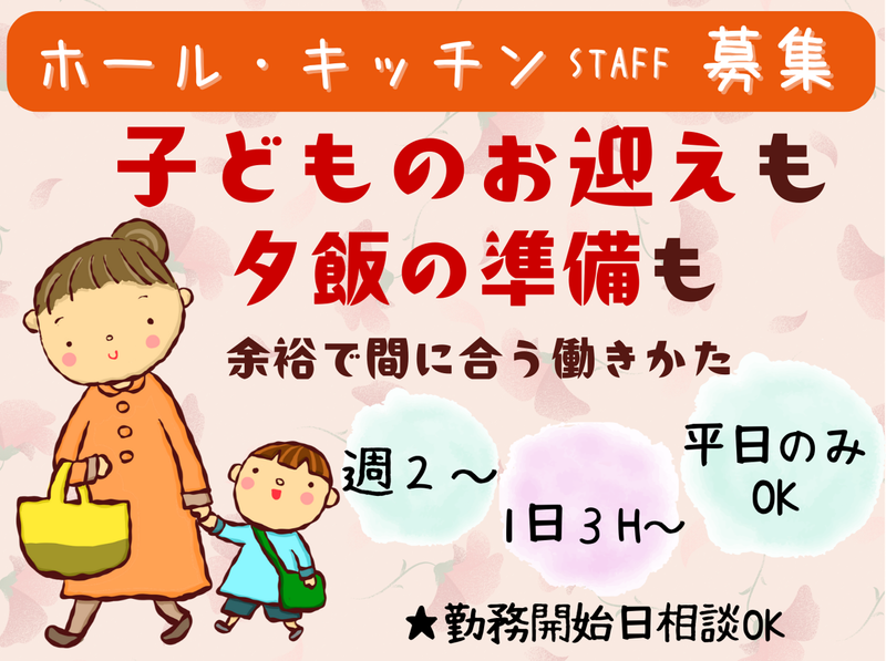 仕事内容 仕事内容  ̄ ̄ ̄ ̄ ̄ ̄ ̄ 【ホール】 ・まずはレジでオーダーを聞いてお会計 ・席へご案内 ・お料理提供 【キッチン】 ・調理補助からスタート♪ マニュアル通りに盛り付け! 慣れてきたら調理もお任せ◎ ホールだけ、またはキッチンだけ で働きたい方もご相談下さい。 気さくで優しい仲間ばかりで、 毎日わいわい楽しく働いています。 1日3・4時間~の超時短勤務もOK 週2~OK! 1週間ごとにシフトを組むので、 スケジュールも立てやすい! お子さんの急な体調不良や 学校行事など、 何でも相談してくださいね。 【【【こんな働き方もできますよ】】】 <子育て中のパートさんは・・・> ・お子様が帰宅するまでにサクッと働く ・お子様の長期休み(春・夏・冬休み、GW)期間中の勤務は相談可 <学生さんは・・・> ・学校の長期休み(春・夏・冬休み、GW) のたびにスポットバイト! 帰省中にサクッとお小遣い稼ぎ◎ (その後のシフトも相談OK)