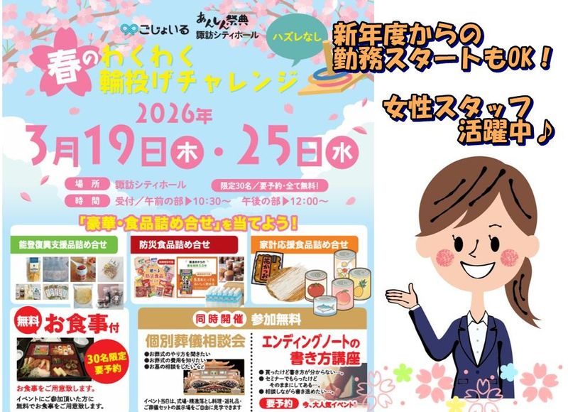 仕事内容 ★新年度(4月)からの勤務開始もOK! ★お子様の入園・入学に合わせてお仕事始めたい方も歓迎! (※ブランクある方もご安心下さい☆) ★2026年新規オープンにつきオープニングスタッフ大量募集! ★勤務は平日のみ。1日2h~、短期・短時間もOK! ■嬉しい特典!ハッピーボーナスあり! 研修期間を卒業で10000円のお祝い金をプレゼント! (※条件/研修期間3ヶ月をクリアーして継続勤務) ■勤務開始日もお気軽にご相談ください。 <お仕事内容> イベントチラシのポスティングになります。 具体的には、 ・諏訪エリア内のご家庭へ徒歩でご案内のポスティン グ ・写真のようなチラシやハガキの配布 ・簡単なPR ・イベントでの受付・接客・事務作業 (※未経験の方でも気軽にお仕事を始められるよう1つ1つ丁寧にお伝えいたしますのでご安心下さい) <嬉しいポイント> 朝はゆっくり10時スタート! 平日のみ、月10日の勤務でOK! 短期・短時間も可!(1日2時間~) 面接時には履歴書不要! 髪色・髪型・服装自由!(過度でなければOK) お子様やご家庭優先の働き方でOK