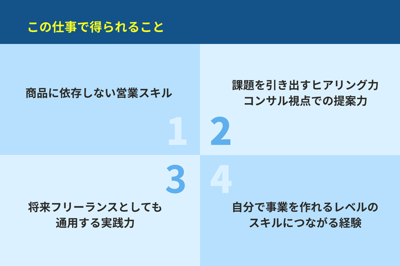 アピールポイント: ──────── 未経験・学歴不問でも1ヶ月で結果が出る理由 ──────── 営業は才能ではなく、構造です。 これまで3年間で30種類以上の商材を販売してきた中で、 商品に依存しない“再現性のある営業フレーム”を構築してきました。 今回のポジションでは、その型をそのまま活用します。 \短期間で成長できる仕組み/ ★営業トークはすべて台本あり ★ヒアリング設計が明確 ★提案の流れは仕組み化 ★代表が商談内容を直接フィードバック ゼロから自己流で学ぶ必要はありません。 成果が出ている順番で実践できるため、 経験や学歴に関係なく、1ヶ月でも大きな変化を感じられる環境です。 営業は「会話力」ではなく「設計」です。 正しい型を使えば、未経験からでも結果に近づけます。 ──────── ◆この仕事で得られること ✅商品に依存しない営業スキル ✅課題を引き出すヒアリング力 ✅コンサル視点での提案力 ✅将来フリーランスとしても通用する実践力 ✅最終的に自分で事業を作れるレベルのスキルにつながる経験 単なる販売ではなく、 「課題解決型の営業」を学べます。 ──────── ◆実際のスタッフ事例 ①元工場勤務 人前で話す仕事は未経験。 2ヶ月目で月収50万円を達成。 その後、3ヶ月目以降は安定して成約を継続。 ②現役大学生 大学に通いながらの挑戦。 2ヶ月目で月収40万円を達成。 現在は月50万円前後を安定して継続。 ③元スーパー店員 これまで営業経験は一切なし。 6ヶ月で月間売上1,000万円を達成。 高単価案件を任されるレベルまで成長。 ⋆ ┈┈┈┈┈┈┈┈┈┈ ⋆