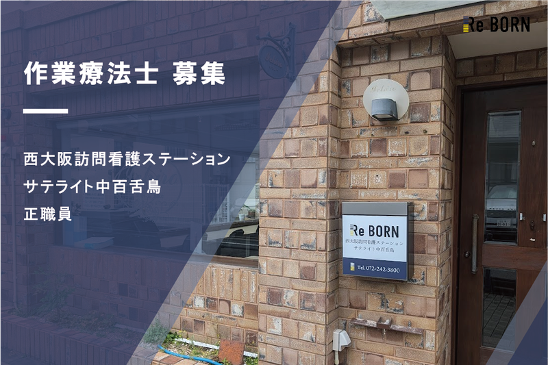 概要・業務内容 リボーングループには、幅広い経験年数・多様な経歴を持つ常勤セラピスト/看護師が130名以上在籍し、大阪府下16拠点でサービスを提供しています。 日々、自己研鑽に励み、各地域で高品質な在宅サービスを提供して頂ける方、是非お越し下さい。 私たちは「働くスタッフ」「ご利用者様」「ステークフォルダーの皆様」の3つの満足度を高める為、仕事の頑張りや成果が正当に評価される報酬制度を準備しています。 在宅での勤務経験は問いません、これまでに培われた人間力、専門性を活かして、ご活躍下さい。 また、正社員のみでなく、パート/アルバイトの方も随時募集しております。 ・給与: 時給1,800円~2,600円及びベースアップ手当月額2,500円(件数制もあり) ・勤務日数: 3日~/週 ・勤務時間: 16時間〜/週 ご応募頂きましたら、簡単な書類審査後、面接のご案内をさせて頂きます。(面接の前に会社説明・施設見学をご希望の方は、その旨、ご相談下さい) 皆様のご応募、心よりお待ちしております。