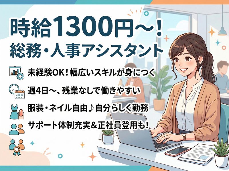仕事内容 \働き方年々アップデート中◎高待遇/ ✨時給1300円〜!経験をしっかり評価! ✨週4日以上!無理なく働ける環境! ✨人事・総務の幅広いスキルが身につく! \サポート業務ならではのやりがい✨/ 社内メンバーに『ありがとう』と 言っていただける機会の多い仕事です♪ デスクワークを中心に本社業務をお任せ。 ✔︎具体的には: ✅電話・来客対応や備品管理 ✅書類作成やデータ入力 ✅会議の議事録作成 ✅面接日程などの応募者対応 ✅求人媒体の更新や手続き補助 など  ̄ ̄ ̄ ̄ ̄ ̄ ̄ ̄ ̄ ̄ ̄ ✔︎入社後の流れ: 当社の雰囲気に慣れていただくために、 先輩社員と一緒に作業を繰り返しながら、 取り組みやすい業務を担当いただきます。 ゆくゆくは様々な業務にも挑戦して下さい!  ̄ ̄ ̄ ̄ ̄ ̄ ̄ ̄ ̄ ̄ ̄ 会社の雰囲気も良く、 仲間と支え合いながら働けます! 携われる様々な経験は必ず次に繋がり、 人生の選択肢を広げる大きな ターニングポイントになるはずです。 また、お任せできることが増えれば 必ず給与アップをしています✨ もちろん頑張りも評価します!  ̄ ̄ ̄ ̄ ̄ ̄ ̄ ̄ ̄ ̄ ̄ ̄ ̄ ̄ ̄