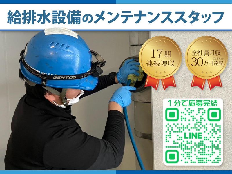 仕事内容 \17期連続増収/ ============ 先月は未経験全員が、 月収30万円以上を達成! ============ ✅賞与年2回(2~3ヶ月分) ✅残業代は1分単位で支給 ✅資格取得は全額会社負担 ✅会社負担でがん保険加入 ✅転勤なし ============ 昔は遅刻も多かった。 言われたことだけやって、 将来なんて考えてなかった。 周りが就職していく中で、 なんとなくバイトを続けてた。 でも―― 結婚した。 子どもが生まれた。 親になってやっと、 「このままじゃあかん」 と思った。 「家族とマイホームに住みたい」 「毎月カツカツで暮らしたくない」 「“かっこいい父親”と思われたい」 そんな気持ちが、 少しでもあるなら。 本気で育てます。 特別な学歴はいりません。 要領の良さもいりません。 必要なのは、 「変わりたい」という覚悟だけ。 過去よりも、 これからをどうするか。 本気で人生を立て直したい人と、 本気で向き合う会社です。 * * * ■ビル ■マンション ■オフィス ■ホテル ■学校 ■病院 ■商業施設 など 大きな建物の給排水設備を 定期点検・メンテナンスする お仕事です。 例えば―― ・地下のポンプ室で 給水ポンプの作動確認 ・屋上や機械室で 貯水槽の点検清掃 ・建物内の排水管を 専用機材で高圧洗浄 ・水漏れや詰まりがないか バルブ・配管のチェック ・点検結果を写真撮影し 報告書を作成 などを行います。 普段は見えない場所にある “建物の裏”を支える仕事です。 放置すれば、 断水・水漏れ・営業停止。 絶対に必要だからこそ、 なくならない仕事です。 企業売上は17期連続増収。 安定性には自信があります。 * * * まずお任せするのは、 ビルの定期メンテナンス。 毎年同じ建物を 担当する仕組みなので、 流れを覚えれば 余裕が生まれます。 ただ最初は、 建物ごとに構造が違うため 正直、覚えることは多いです。 ですが―― 必ずチームで動きます。 ※1班2~3名の8班体制 ※大型案件は5名1班 ※1日1~2件を担当 先輩が横で教えますので、 一人で現場に放り出すことは 絶対にありません。 * * * ■将来のステップ 独り立ち後、 役職が上がれば 希望に応じて 緊急対応やトラブル案件など 難易度の高い業務も担当可能。 その分、 手当・役職給で収入UP! “責任=稼げる”仕組みです。 企業売上は17期連続増収。 景気に左右されにくい 安定事業です。 ========== LINE応募受付スタート ========== ★応募後、メールでLINE追加URLを送付 ★面接日程の調整や連絡はLINEで完結 ★HP:https://www.krs2007.co.jp/