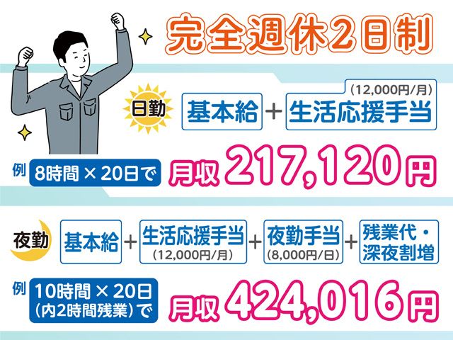 勤務時間 (日勤) 8:30~17:30(休憩60分) (夜勤) 19:00~翌6:00(休憩60分)※2時間の残業込み