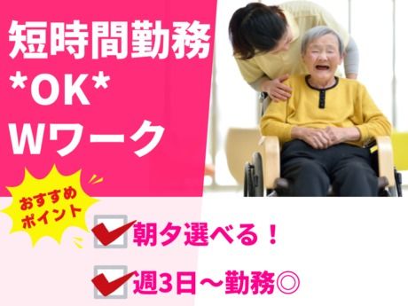 仕事内容 \ここがポイント/ ★無資格・未経験スタートOK!初めての方も大歓迎! ★朝のみ・夕のみ選べるから、家事やプライベートとの両立も◎ ★週3日~OK!固定シフトも可能で予定が組みやすい♪ ★WワークOK!30~50代の男女スタッフが活躍中! *・。・。*・。・。*・。・。* <仕事内容> \★食事ケアスタッフ募集!短時間で働ける★/ 有料老人ホームでの朝食・夕食時のサポート業務です♪ ・お茶の準備 ・整容(身だしなみのお手伝い) ・オムツ交換やトイレ介助 ・食事介助 ・下膳サポート など! オムツ交換は介護度が高い方の場合、2名体制で対応するので安心♪ また、施設全体で協力し合う体制が整っており、 他職種スタッフも食事介助を行う、温かい職場環境です◎ *・。・。*・。・。*・。・。*