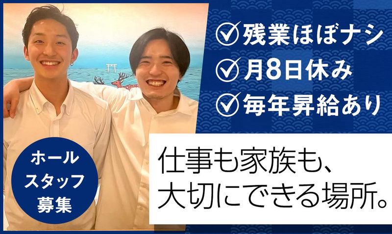 仕事内容 ✨・。2025年10月オープン。・✨ 人気の逸品和食居酒屋で、 正社員×ホールスタッフ募集! <<注目ポイント>> ✅月給30万円以上で安定 ✅賞与年2回・家賃補助など待遇充実 ✅毎年昇給あり!頑張りをしっかり評価! ✅週休2日制、月8休み!残業ほぼナシ ✅年末年始休暇・有給休暇の取得可能 ✅希望シフト制でお休みが取りやすい ✅副店長や店長へのキャリアUPも! ──────────────────── ⭐お仕事内容⭐ 10月大宮にオープンする新店舗 「京出汁おでんと旬菜天ぷら 鳥居くぐり横浜店」で ホールスタッフの お仕事全般をお任せします。 ◎具体的には・・・ 〇お客様のご案内・接客 〇料理・ドリンクの提供 〇予約管理/お会計対応 〇在庫管理 〇シフト&アルバイトスタッフの管理 〇清掃/片付け/開店・閉店準備 ※業務は経験・スキルに応じてお任せします。 ※ホール管理や予約業務にはタブレット等を 導入しており、効率よく働けます◎ <1日の流れ> 14:00▶出勤・仕込みスタート 16:00▶店舗準備(開店前の最終チェック) 17:00▶営業開始(ご案内・料理提供など) 21:00▶片付け/仕入れチェックなど 23:00▶退勤 ※状況に応じて早く 店仕舞いすることもあります。 ──────────────────── ⭐安定の環境で長く活躍可能  ̄ ̄ ̄ ̄ ̄ ̄ ̄ ̄ ̄ ̄ ̄ ̄ ̄ ̄ 経験・スキルに関わらず、 月給30万円スタート。 実力に合わせてさらにUPも可能。 頑張りはしっかり評価します! 毎年の昇給や、賞与年2回など 収入UPのチャンスがたくさん。 安定収入を得ながら、 成長することが可能です! ・・・・・・ ⭐しっかり休める環境  ̄ ̄ ̄ ̄ ̄ ̄ ̄ ̄ ̄ ̄ ̄ ・2週間毎の希望シフト制/月8休み、 ・繁忙期を除いて残業はほぼなし ・閑散期は、早めの店じまいも有 ・年末年始休暇、有給の取得 など 社員一人ひとりが快適に働ける 環境を大切にしており、 ワークライフバランスを重視した 働き方が叶います。 家庭と両立して働きたい方や、 プライベートを大切にしたい方にも ピッタリの環境です。 ・・・・・・ ⭐業績絶好調!成長できる環境!  ̄ ̄ ̄ ̄ ̄ ̄ ̄ ̄ ̄ ̄ ̄ ̄ ̄ ̄ ̄ 副店長や店長はもちろんのこと 希望に合わせてキッチンなど 異業種への職種変更も可能! 会社が拡大期に入っているので、 希望や適性に合わせて 幅広いキャリアUPが可能です。 頑張り次第でマネージャー職や 管理職になることも! ・・・・・・