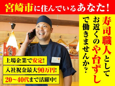 仕事内容 未経験から寿司職人へ。エリア外転勤なし!年数回の昇格・昇給も可能! お寿司を握ったことがなくても 飲食店で調理業務の経験のある方は、 最短2~3ヶ月でお寿司を 提供できるようになりますよ♪ ー・ー・ー・ー・ー・ー・ー < このお仕事のミリョクPoint!> ●入社1年目から平均月収35.8万円も可能! ●入社祝金最大90万円!/規定あり ●社員紹介手当最大60万円!/規定あり ●食事補助あり!(1勤務に1食無料) ●動画マニュアル完備!安心の教育体制! ●髪型・髪色自由!※規定あり ●前給制度あり※規定あり ●社員割引(会計から20%オフ) ●カンリー福利厚生導入中! (映画・ネイル・コンビニなど数百種類の割引が利用し放題) ー・ー・ー・ー・ー・ー・ー <お仕事内容> 寿司居酒屋「や台ずし」の 店舗スタッフのお仕事! ●接客や料理の配膳などのサービス業務 ●寿司のにぎりや一品料理の調理 ●シフト作成・売上管理などをお任せ! ー・ー・ー・ー・ー・ー・ー <自己申請昇格制度あり> 年数回の昇格・昇給も可能! 2年目で店長になった方も! 【キャリアアップ例】 店舗スタッフ ↓ 店長 ↓ チームリーダー ↓ エリアマネージャー ↓ 部長 ー・ー・ー・ー・ー・ー・ー <や台ずし社員のスケジュール> ※実働8時間のシフト制 営業時間15:00~翌1:00 の場合 14:00~ 出勤!今日も1日頑張りましょう! 14:00~15:00 オープン前準備 15:00~23:00 接客・調理 (※途中休憩1時間あり) 23:00~ 退勤!お疲れ様でした☆ミ ー・ー・ー・ー・ー・ー・ー <や台ずしについて> 未経験から短期間で寿司職人を目指せる! 「や台ずし」は、本格職人が 一貫一貫丁寧に握る寿司居酒屋です。 寿司以外にも、旬の素材の一品料理や 揚げ物などの居酒屋メニューが多いのも魅力。 客層は会社帰りの団体から女性グループ、 子連れのファミリーまで幅広いです。 ★職場の雰囲気もわかるInstagram運用中!★ 【や台ずし公式 Instagram】 https://www.instagram.com/yataizushi_official/ ー・ー・ー・ー・ー・ー・ー <勤務エリア・店舗は面接時のご相談となります。> ・や台ずし 橘通町 宮崎県宮崎市橘通東3-2-6 LJR日豊本線・JR日南線宮崎駅西口 徒歩13分 営業時間/15:00~翌1:00 ・や台ずし 西橘町 宮崎県宮崎市橘通西3-8-16 LJR日豊本線宮崎駅西口 徒歩13分 営業時間/16:00~翌1:00 ー・ー・ー・ー・ー・ー・ー