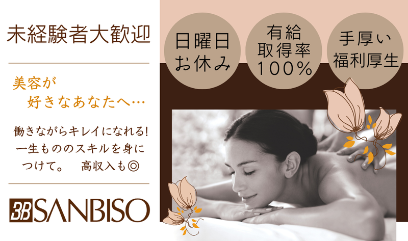 仕事内容 【仕事もプライベートも充実できる‼】 ♢日曜日が定休日! 週休二日制! (その他、年間を通して特別休暇複数あり) ♢未経験者大歓迎♡ ♢長く働きたい方歓迎! (育休・産休取得実績多数あり) ♢希望シフト制でお休みが調整しやすい♪ ♢髪色・髪型応相談(清潔感がある範囲内で) ♢残業ナシ ♢社員割引あり! ♢インセンティブ制度や業績賞与あり! ♢充実した研修制度で安心スタート◎ ■サロンの思い■ 創業から40年! 三美創ビューティースタジオは、 確かな技術と厚い信頼で、 これまで多くの女性のみならず 男性の美に対する想いや悩みにも 寄り添って参りました。 見た目だけの美しさを求めるのではなく、 「外面」「内面」「精神面」 これら3つの調和がとれたとき、 本当の美しさは創られる。 という『三面美容』の考え方を基に、 お客様の真の美しさを引き出し、 最大限輝かせることを理念としております。 <具体的な仕事内容> ・脱毛・美顔・痩身などの施術 ・フロント応対 (受付、お会計、お見送り等) ・サロン内の美化 ・カウンセリング ・お客様へのアドバイスやご提案 <入社後の研修> 入社後は、身だしなみから接客応対、 そして美容の基本を一から学べ、 お客様へのケアに必要な 知識や技術の他にコミュニケーション スキルも学べる充実した研修を 受けられます♪ スタッフ同士での練習やチェックを 受けてから、自身を持って エステティシャンとしてデビューできる! 研修を受けているうちに 自分もキレイになれちゃうかも♡ <職場の雰囲気> 9割以上のスタッフが販売職、 工場勤務、介護士などの異業種からの 入社です。 そのため未経験からでも、経験スタッフが しっかり分かるまで丁寧に優しく 教えてくれるので安心です♪ お客様から「スタッフになりたい」と 言われるほど明るい雰囲気が自慢です♡ 上下関係は無く、自由に コミュニケーションがとれる環境です◎ <インセンティブ制度> ノルマは無く、 個人の努力はインセンティブで しっかりとお給与に反映されます◎ 頑張った分だけランクアップ昇給や インセンティブで適正に評価され 実感できるので、とてもやりがいがあります♪
