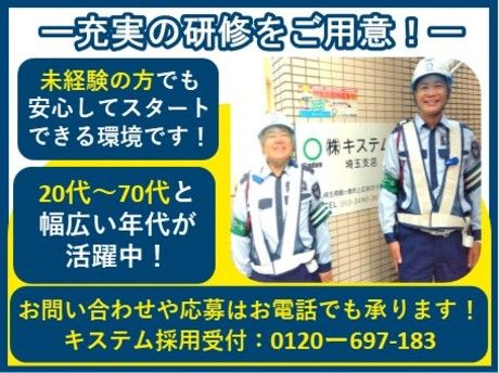仕事内容 ■充実の防寒対策!キステムで働く魅力 最新のヒートベスト支給!旧来の装備より暖かさ倍増 ・高機能ウェア:保温性の高い防寒着、ヒートベスト、防寒ズボン ・あったかグッズ:ネックウォーマーお試し支給、カイロ支給 ・安心の備え:緊急用携帯トイレ(1人2個支給) 実際にキステムで働くスタッフはこんなメリットを 感じながら活躍しています! 【60代・セカンドキャリアの方】 「年金だけでは不安で始めました。ここは定年制度がなく、年齢で給与が下がることもありません。 有給休暇も最大20日付与されるので、体力的に無理なく安定して働けるのが一番の魅力です。」 【40代・警備経験者】 「経験者として待遇の良さに惹かれました。交通誘導2級で日給+500円、 交通費・ガソリン代も全額支給。雨天中止もほぼ無く、日給保証もあり。 上場グループで安定感が違います。」 【30代・Wワーカー】 「週2日からOK でシフトの融通が利くので副業に最適です。早く終わっても日給保証があり、 交通費も全額支給。制服や防寒着(ヒートベスト)、ヘルメット、安全靴、カイロなど、 全て無料で貸してくれるので、自己負担ゼロで始められました。」 ■交通誘導2級保持者・警備経験者多数活躍中! 現場はNTT電話回線工事現場。 歩行者や車両の安全を守るための 交通誘導業務をお願いします。 あなたの「経験」や「資格」が しっかり評価される環境です! ※車持ち込できる方は優遇します 【経験者が選ぶ理由 ~キステムの魅力~】 ・交通誘導2級保有者は日給+500円支給! ・車持ち込みの方は日給+500円! ・プライム市場上場グループ企業で安定勤務 ・装備品・制服一式は無償貸与(自己負担なし) ・日給保証制度・交通費全額支給 ・賃金改定年1回 ・有給最大20日付与・定年なし ・年齢による給与変動なし ・雨天中止ほぼなしで、安定して勤務可能 ・資格取得支援制度あり! 警備業務経験をお持ちの方や ミドル・シニア世代の方、 定年後のセカンドキャリアとして 福利厚生がしっかりした環境で、 感謝される仕事をしたい方にピッタリ! お電話でのご応募も受け付けております! 連絡先:0120-697-183 (採用担当まで) ────────────────────────── 【1日の流れ】 1.出勤前にアルコールチェックを実施 2.現場到着後、作業前ミーティングを実施 3.交通誘導業務を開始 ※1日に複数現場がある時は、別現場への移動あり 4.終業後アルコールチェックの実施と 翌日の勤務情報を自社チャットアプリで確認 ────────────────────────── 【当社について】 当社はエクシオグループ株式会社の一員として、 警備事業、施設管理事業、人材派遣事業などを 展開する総合警備会社 。 NTT関連や公共事業を中心に、 交通誘導や施設警備、鉄道警備(列車見張り)など、 幅広い分野で社会の安全と安心を支えています。 安定した経営基盤と充実した福利厚生、 柔軟な勤務体制を備え、 経験者・未経験者問わず、 多くの方が活躍できる環境を提供しています。 *──────────────────────* 【勤務拠点について】 ・拠点名:埼玉支店 ・住所 :埼玉県鶴ヶ島市上広谷22-5 アメニティパレス2F ・TEL :050-3490-3617 *──────────────────────* ■業務に関わる装備品を一式貸与 自己負担は一切なし! 制服・靴・ヘルメットなど業務にかかわる装備品は無償で貸与しております。 季節ごとに防寒着やファン付き空調服も無料貸与 ■最大20日付与される有給休暇 1年目は10日、以降は1年ごとに増加し、7年目以降は最高20日! 取得しなかった有給休暇は翌年に繰り越し可能の為、 長期勤務されている方からはご好評いただいております。 ※有給休暇の付与に関しては規定あり ■定年制度なし 当社では定年制度がございません。20代・30代を始め、 40代・50代の中高年の方や60代のシニアの方まで幅広い年齢層の方々が活躍中! 9割近くが未経験での入社になります。 定年後のセカンドキャリア 感謝される仕事につきたい、交通誘導警備業務の資格を活かしたい方